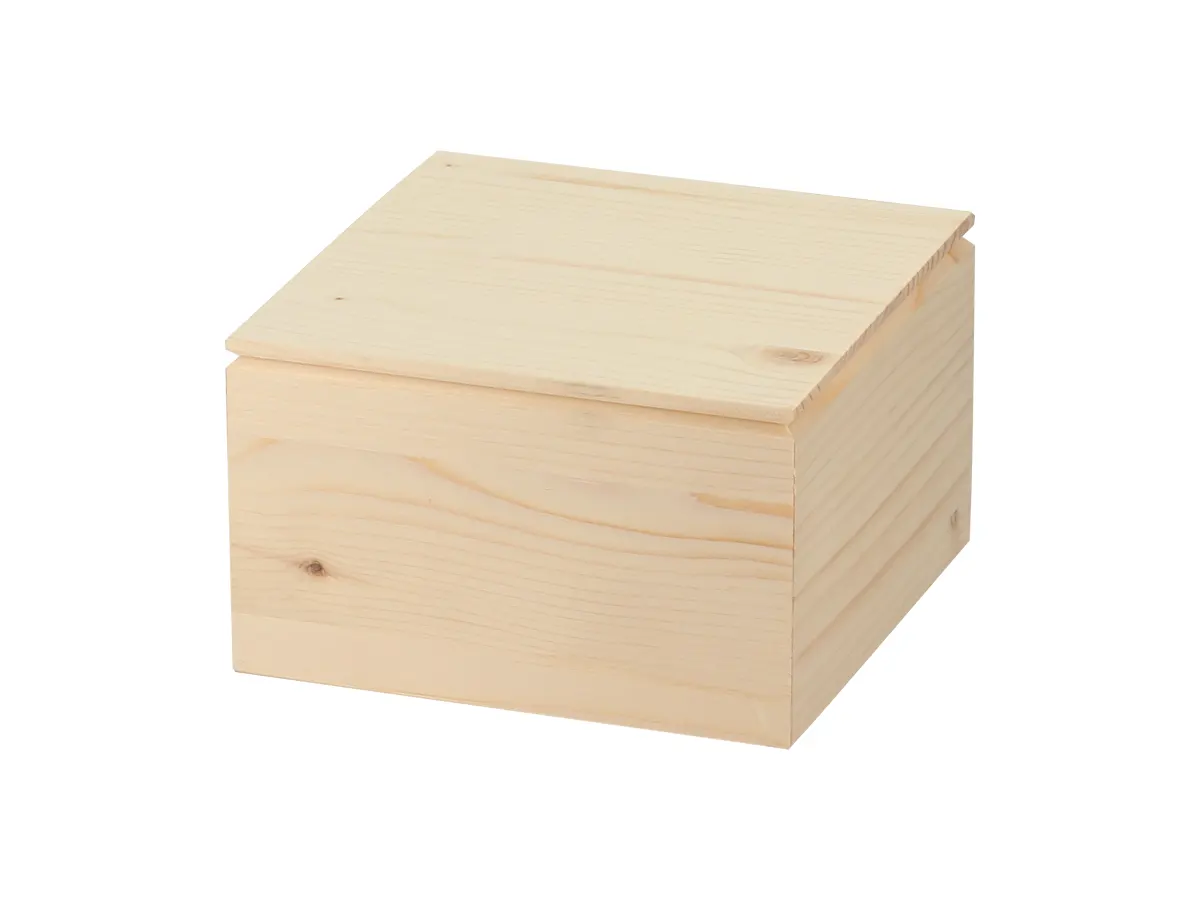Il design pulito con coperchio ad incastro a pressione e bisellatura sul bordo garantisce una chiusura sicura e una facile apertura. La finitura neutra lascia spazio alla creatività: il Piccolo contenitore o confezione regalo può essere personalizzato con vernici, incisioni laser, stampe o decoupage, rendendolo unico e adatto a ogni occasione.